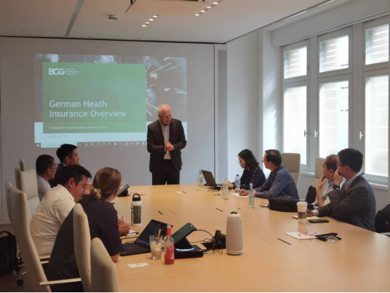 7月18日下午,调研组参访了波士顿咨询公司柏林办公室。在座谈会上,波士顿咨询公司欧洲合伙人、主任Jens Grueger致欢迎辞,柏林办公室工作人员从健康保险体系的分类、私人保险和法定保险的特点、当前健康保险体系内存在的挑战和对未来发展的建议四个方面对德国健康保险体系进行了系统、全面的阐述。