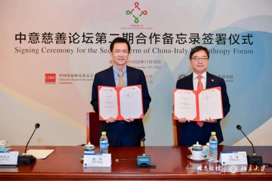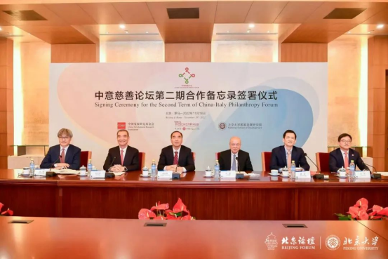 2022年11月,“中意慈善论坛”第二期(2022-2025年)合作备忘录签署仪式举办。中国发展研究基金会、意大利都灵大学中国研究中心以及北京大学国家发展研究院三方签署了该合作备忘录。三方共同发起了为儿童公益项目筹款的联合倡议。所筹款项将用于支持中国河北省、陕西省和甘肃省的“慧育中国:山村入户早教计划”项目,以及罗马的班比诺·格苏儿科医院与中国医疗机构的合作,和为罹患肿瘤的儿童提供救治。